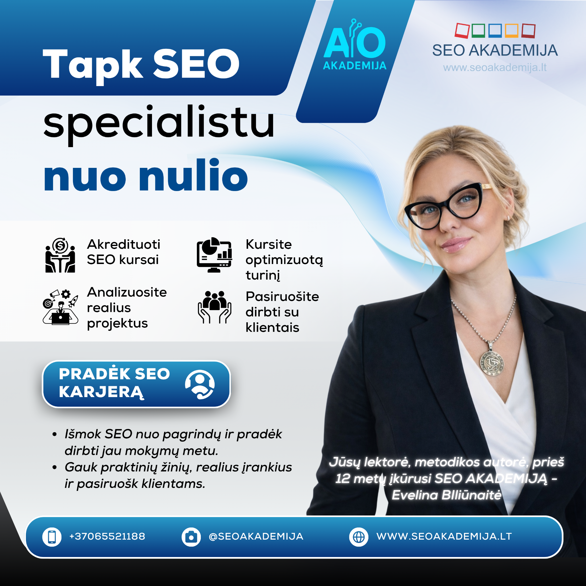 - Tai pilna SEO specialisto mokymų programa, kuri dėstoma SEO AKADEMIJOJE jau 12 metų ir nuolat atnaujinama pagal rinkos pokyčius.