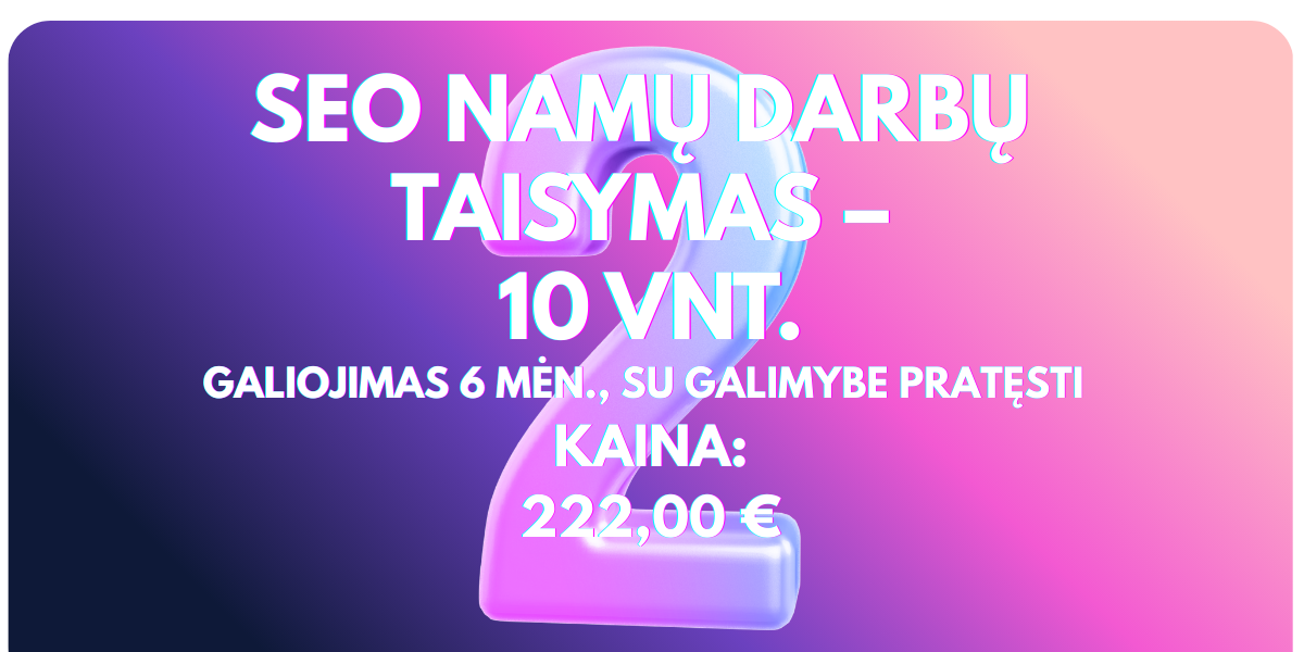 - SEO NAMŲ DARBŲ TAISYMAS - 10 vnt. (galiojimas 6 mėn., su galimybe pratęsti), KAINA: 222,00 EUR.