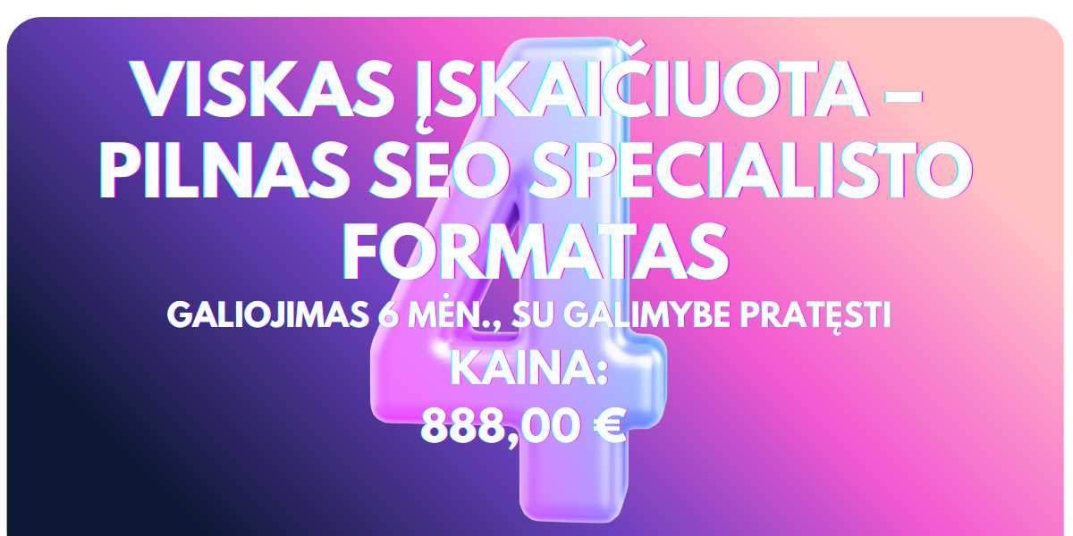 - VISKAS ĮSKAIČIUOTA - PILNAS SEO SPECIALISSTO FORMATAS (galiojimas 6 mėn., su galimybe pratęsti), KAINA: 888,00 EUR.