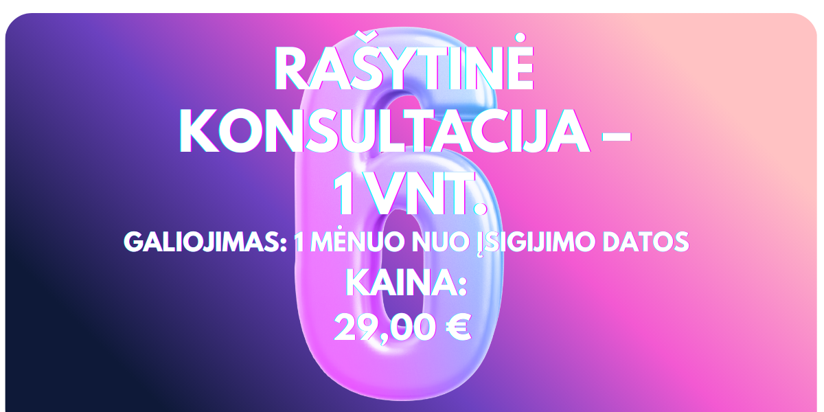 - RAŠYTINĖ KONSULTACIJA - 1 vnt. (galiojimas 1 mėnuo nuo įsigijimo datos), KAINA: 29,00 EUR.
